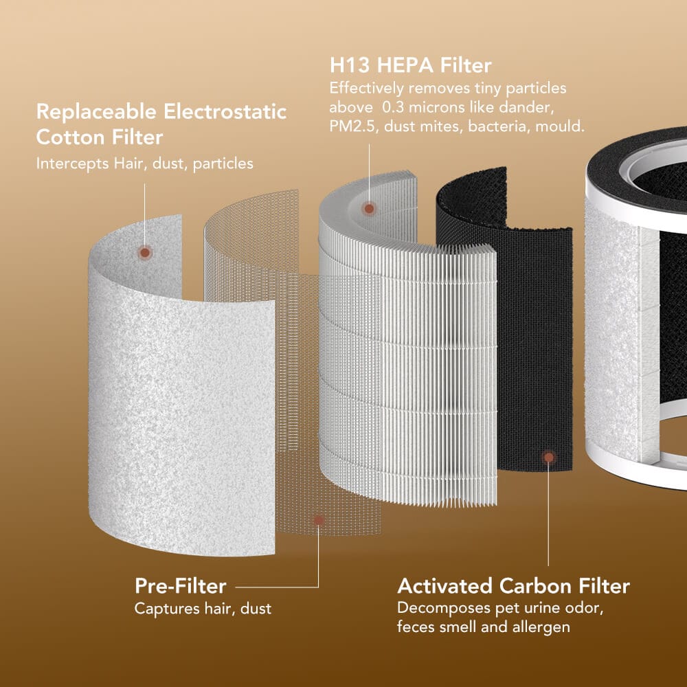 Replaceable Electrostatic Cotton Filter, Pre-Filter, H13 HEPA Filter, Activated Carbon Filter.
