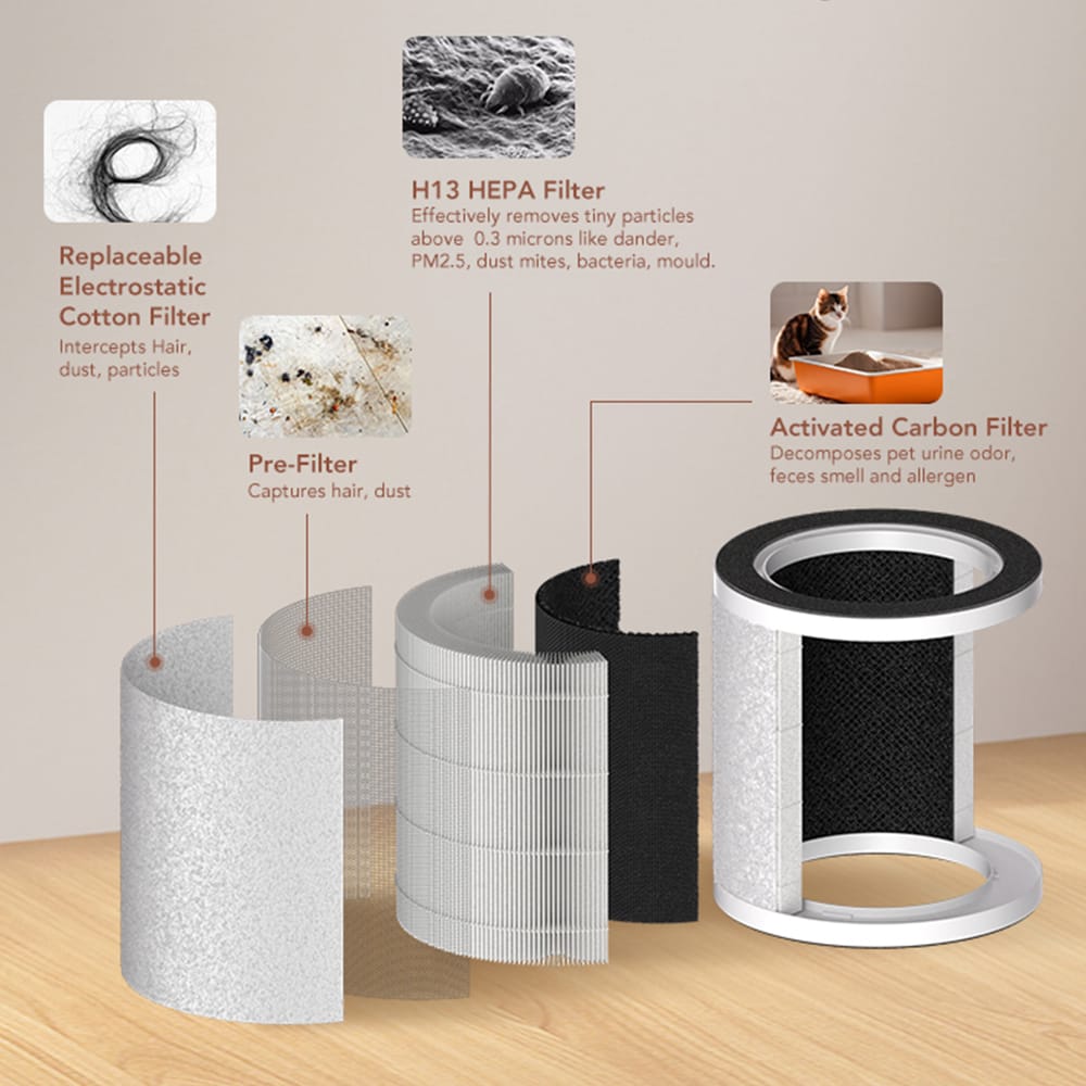 Replaceable Electrostatic Cotton Filter, Pre-Filter, H13 HEPA Filter, Activated Carbon Filter.