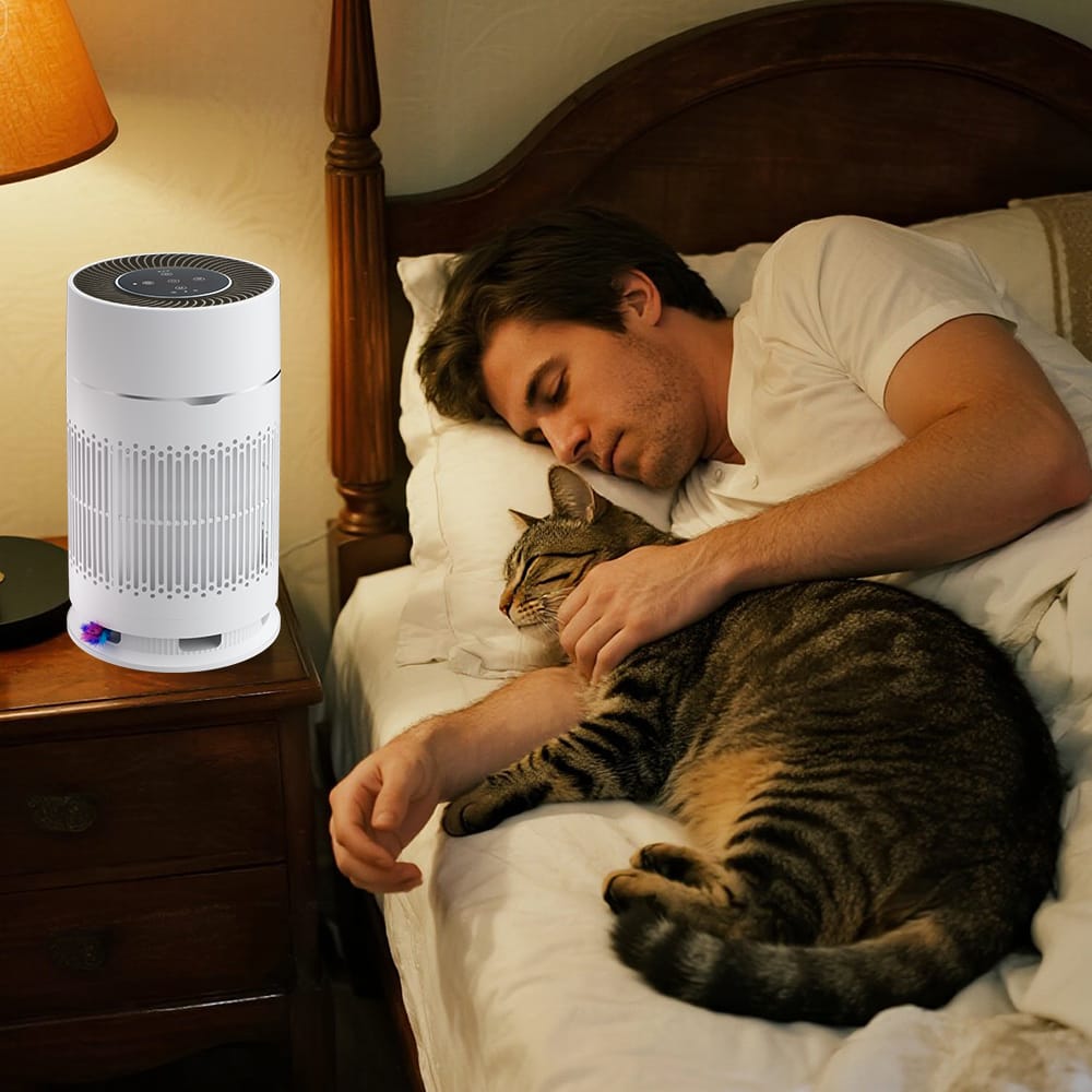 - Quiet Sleep ModeLow-noise but high efficient purification in sleep mode. And the ambient blue light keep you in warm mood with your pets.
