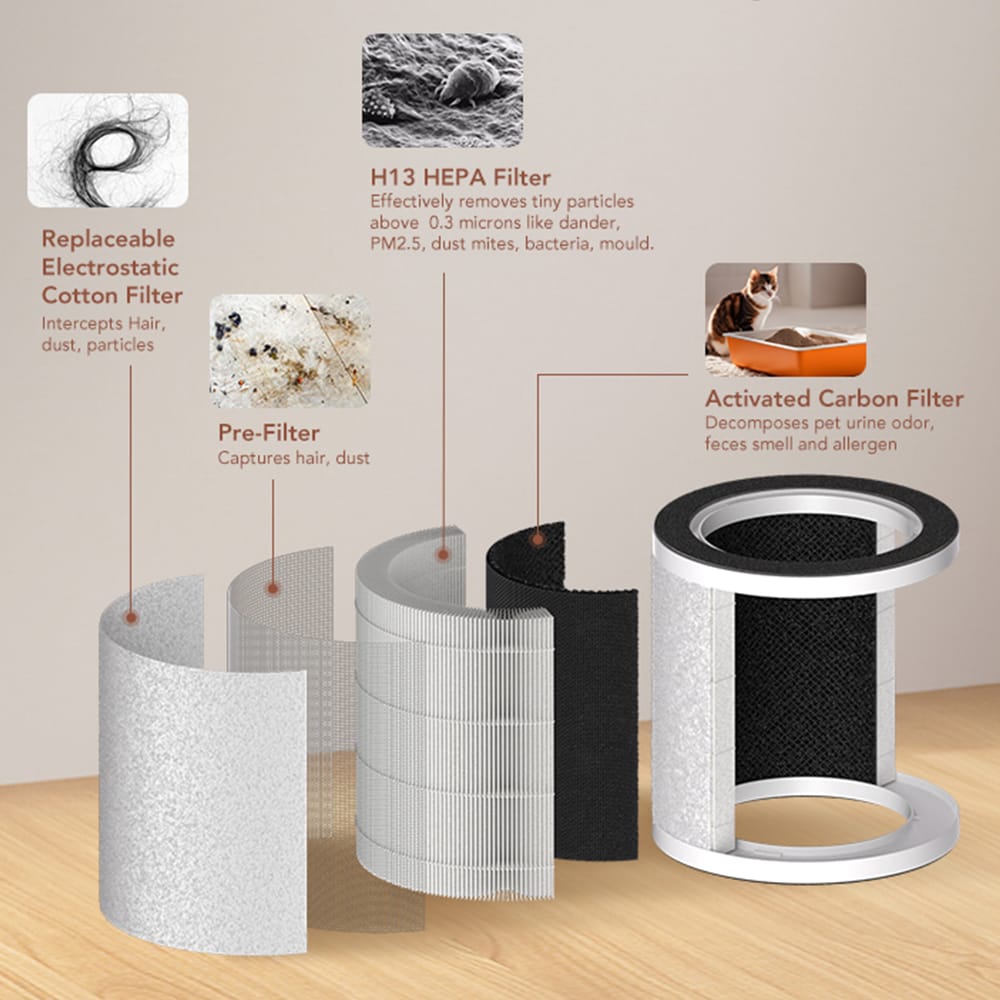 - 4-in-1 HEPA FilterReplaceable Electrostatic Cotton Filter, Pre-Filter,H13 HEPA Filter and Activated Carbon Filter